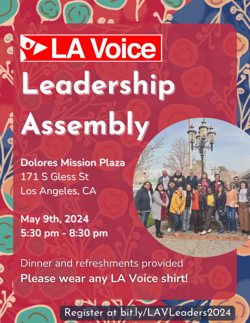 Join us at the LA Voice Leadership Assembly on Thursday, May 9 from 5:30-8:30 PM at Dolores Mission, 171 S Gless St, Los Angeles, CA 90033. Register at bit.ly/LAVLeaders2024.