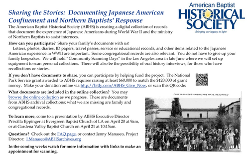 The American Baptist Historical Society is gathering documents and stories about the internment of Americans of Japanese descent during WWII. Sunnyside Baptist Church is giving away some pews. "Reimagining Church" is the theme of our Third Thursday gathering on March 21st. An updated Youth & Young Adult Retreat flyer is included with more opportunities for those in our ABCOFLASH family. Read it here