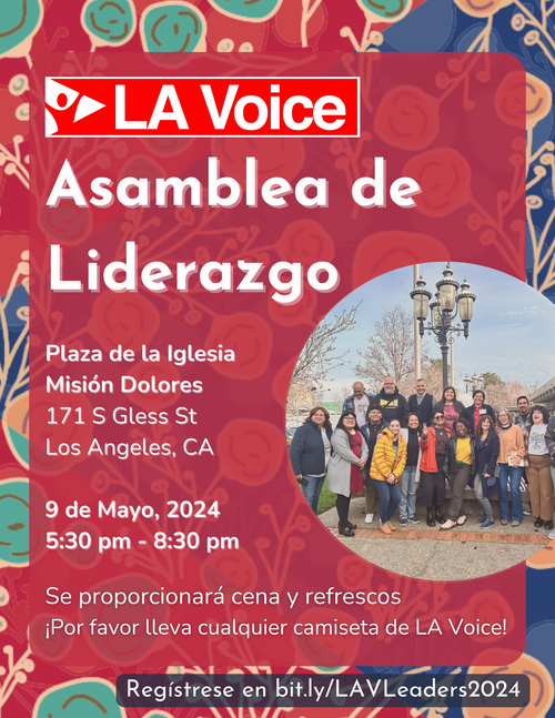 Join us at the LA Voice Leadership Assembly on Thursday, May 9 from 5:30-8:30 PM at Dolores Mission, 171 S Gless St, Los Angeles, CA 90033. Register at bit.ly/LAVLeaders2024.